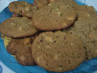 Misture a farinha de trigo,o bicarbonato de sódio, o sal e a canela.Em uma bacia bata a margarina com o açúcar granulado ,o açúcar mascavo e a pasta de amendoim.Junte o ovo e a baunilha e continue misturando.Aos poucos acrescente a mistura de farinha previamente separada.Depois acrescente o amendoim moído. Por último junte o chocolate branco e misture delicadamente .